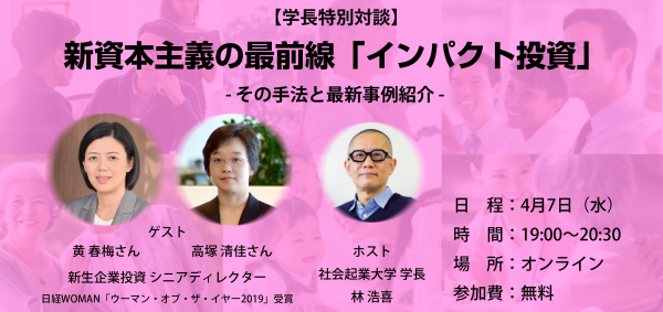 今回の学長特別対談では、邦銀系初のインパクト投資ファンドの立上げに取り組み日経WOMAN「ウーマン・オブ・ザ・イヤー2019」も受賞された、新生企業投資(株)インパクト投資チーム シニアディレクターである黄春梅さんと高塚清佳さんのお二人にご登壇いただき、そもそものインパクト投資の定義から国内外の最新動向、社会起業家として事業成長を目指す人たちへのアドバイスなど幅広い観点でお話いただきます。