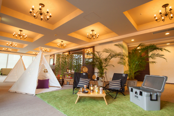 ホテルの広々したお部屋をキャンプ会場にし、テントスペースとバーベキュースペースに分かれています。1区画2〜6名様までご利用でき、7名様以上ですと全区画の貸し切りが可能で開放感のあるスペースでキャンプ気分が味わえます。