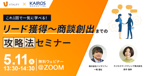 ベトナムオフショア開発やAI(人工知能)事業を行う株式会社バイタリフィ(所在地:東京都渋谷区、代表取締役:川勝 潤治)は、マーケティングオートメーション「Kairos3」の開発・提供や自社メディア「マケフリ」の提供を行うカイロスマーケティング株式会社(所在地:東京都渋谷区、代表取締役:佐宗 大介)と共催で無料ウェビナー『これ1回で一気に学べる!リード獲得〜商談創出までの攻略法セミナー』を2021年5月11日(火)に開催します。