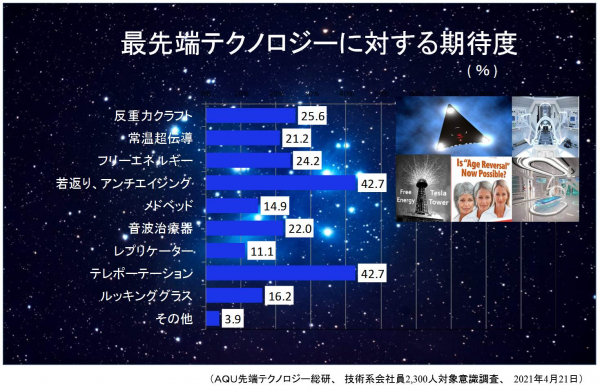 「若返り」、「反重力クラフト」、「フリーエネルギー」などに期待の声! 先端テクノロジーの市場調査会社、AQU 先端テクノロジー総研(代表、子安克昌)がSF映画の未来技術について、技術系会社員2,300人を対象に意識調査を実施したところ、非常に興味深い結果が得られました。