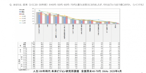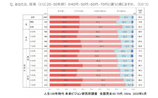 また、40-70代の各年代が、従来(とくに20・30年前)の同年代と違うと感じるかについては、