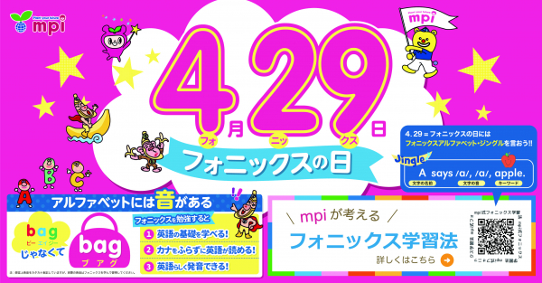 英語教育41年の株式会社mpi松香フォニックス(創立:1979年、代表者:竹村千栄子、以下mpi)は、英語の「文字」と「音」の関係を学び、正しい発音を身につける「フォニックス学習法」の記念日として、「4(フォ)」「2(ニ)」「9(クス)」の語呂合わせから4月29日を「フォニックスの日」として2017年に制定しました。(一般社団法人 日本記念日協会認定)4年目となる今年は5つのキャンペーンを同時開催中。