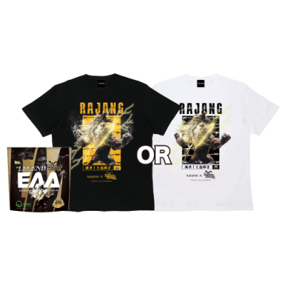前面にプリントされた激昂した「ラージャン」がインパクト大のコラボTシャツは2色展開です。「ラージャン」のような筋肉を手にしてほしいという願いを込めてリリースする「筋獅子」TシャツはそれぞれコラボEAAとのお得なセット販売を行います。