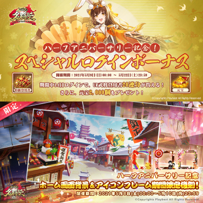 Playbest Inc. (東京都中央区)は、現在配信中のiOS /Android向けゲーム「三国志名将伝」において、5月をもちまして、『三国志名将伝』は正式サービス開始より半年を迎えました。これもひとえに、ユーザーの皆様の厚いご支持によるものと思っております。運営チーム一同、心より御礼を申し上げます。