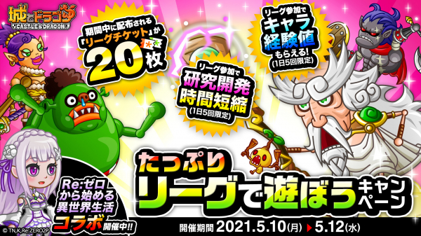 株式会社アソビズム(本社:東京都千代田区、代表取締役:大手智之)は、App Store・Google Playにて好評配信中の『城とドラゴン』で、2021年5月10日(月)より「たっぷりリーグで遊ぼうキャンペーン」を開催いたします。