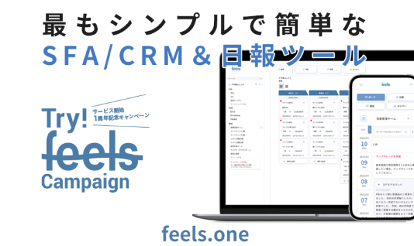 「Try! feelsキャンペーン」は、4月22日(木)〜7月20日(木)の期間中に、報告のAI感情分析を体験することができる「Try! feels Report」と、新機能のSFA(営業支援)/ CRM(顧客管理)を最大6ヶ月無料で試すことができる「Try! feels SFA」を合わせた、1周年記念キャンペーンです。