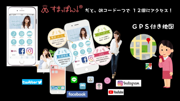 すまっぽん!は、スマホの画面にお店の情報を集めスマートフォンのホーム画面におけるPWAです。店舗によって並べるものは、異なりますが、通常は、電話やマップ、インスタやTwitterなどSNS、食べログやぐるなびなどを設置しています。今回は、非接触型メニューとして、写真やPDFまたは、WEBサイトに掲載したメニュー表をリンク付けます。すまっぽん!は、障害者継続就労支援A型事業所の株式会社カムラックとの共同開発サービスです。