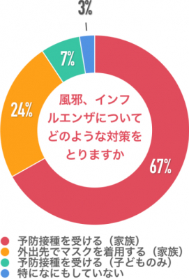 ご回答いただいた方のお子さんに風邪、インフルエンザ対策について、「予防接種を受ける(家族)」が67%、「外出先でマスクを着用する(家族)」が24%、「予防接種を受ける(子どものみ)」が4%、「特になにもしていない」が3%でした。