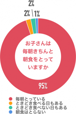 「毎朝とっている」が95%、「ときどき食べる日もある」が2%、「ときどき食べない日もある」が2%、「朝食はとらない」が1%という回答でした。