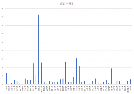 都道府県別に見ると、最多が東京(83)、以降、大阪(31)、愛知(27)、神奈川(26)と大都市中心に分布していることがわかります。また、実施が確認できていない県が5県(福島県、鳥取県、大分県、宮崎県、佐賀県)あり、全国への普及が待たれます。