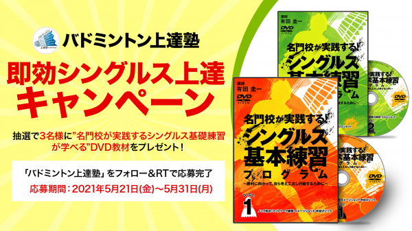 株式会社Real Style (本社:奈良県大和高田市、代表取締役:鍵谷 健、以下 当社) は、2021年5/21日(月)〜5/31(月)まで、当社が運営する「バドミントン上達塾」公式SNSキャンペーンを実施しています。