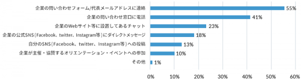 「自分の意志を企業に伝える最適な手段」として最も多く選ばれたのは「企業の問い合わせフォーム・代表メールアドレスに連絡」(55%)。「リアルイベントへの参加」は10%