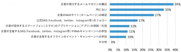 ●「企業と何でつながりたいか」は「メールマガジン」が最多(39%)。「SNS」は11%にとどまる
