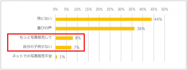 ・写真販売に関する保護者から寄せられた意見として、写真販売の機会を増やしてほしいという要望や、自分の子供の枚数が少ないという声も寄せられていた。