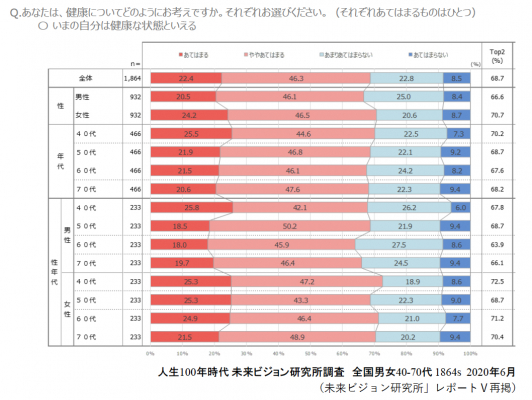 健康寿命は男性が72.14歳・女性が74.79歳とされていますが、健康寿命はあくまで要介護者を含むさまざまな体調の人を含む平均であって、実際には、70代の7割は自分を「それなりに健康」だと認識しています。