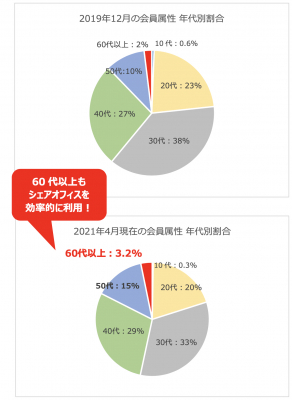 2021年4月の累計会員年代属性で、60代以上の利用者は、新型コロナ感染拡大前は2%でしたが1.6倍の3.2%に増加。50代の利用者も、10%から15%に増加しています。同時期に実施した会員アンケートでは、60代以上の方がシェアオフィスを利用するメリットや理由について「自宅で仕事をするよりも集中できるのが良い」など、自宅から少し距離を置いて仕事をする様子が窺えました。また、平日毎日利用するヘビーユーザーの70代会員からは「急な仕事が入ったときに、出社せずに仕事ができて良かった」と「職住近接」の拠点が多い当社ならではのメリットを感じさせるコメントも聞かれました。