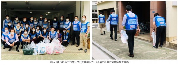 環境にやさしい自社開発製品の“海ごみゼロウィーク”デザイン 青い「着られるエコバッグ」着用し清掃活動を実施 コロナ禍で社員の一体感も強化 浅草橋の本社周辺にて 6月2日