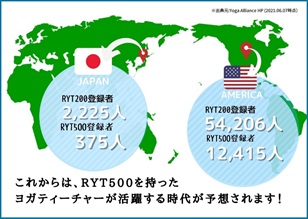 日本におけるRYT500の登録者は375人(2021年6月時点)となっており、RYT200の登録者2,225人のうち、わずか16.8%にとどまっておりますが、近年、オンライン対応により「RYT200」取得者が増えていることから、ヨガインストラクターの差別化として、今後は上位資格「RYT500」の取得者の増加が予想されます。