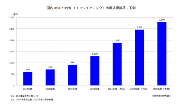 【矢野経済研究所プレスリリース】生命保険領域における国内InsurTech市場に関する調査を実施(2021年)〜2021年度の国内InsurTech市場は前年度比145.7%の1,880億円の見込〜