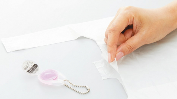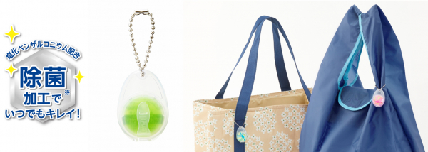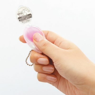 コンパクトな2g入りで、約400回使用可能。本体のミニケースはチェーンとクリップ付きで、エコバッグに提げたり、財布のカードホルダーに挟んだりと、持ち歩きにも便利です。種類は、アロエエキス配合(グリーン)とコ ラーゲン配合(ピンク)の2種類。メーカー希望小売価格は330円(税込)です。