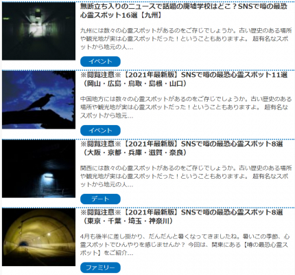 「日本の危険な心霊スポット100選」では、SNSやネット上、口コミで話題の最恐心霊スポットを調査し、一覧として表示しています。