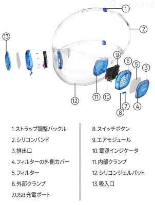 片方から呼気のために空気を中へ送風し、もう片方から吐息を排出して、マスクの中の空気を常に新鮮に保ちます。