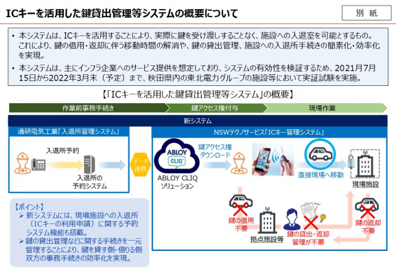 NSWテクノサービス株式会社(本社:東京都渋谷区、代表取締役社長:中山 寿人、 以下「NSWテクノサービス」)、通研電気工業株式会社(本社:宮城県仙台市、取締役 社長:竹原 秀臣、以下「通研電気」)、東北電力株式会社(本店:宮城県仙台市、取締役 社長 社長執行役員:樋口 康二郎※、以下、「東北電力」)は、このたび、ICキー(電子鍵)を活用した鍵貸出管理等に関する新たなシステムを開発いたしました。