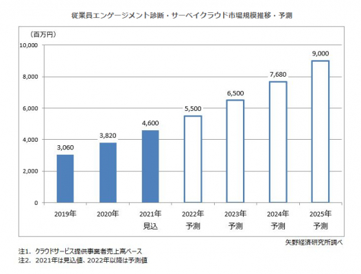 2021年の従業員エンゲージメント診断・サーベイクラウド市場規模は、事業者売上高ベースで前年比120.4%の46億円になると見込む。