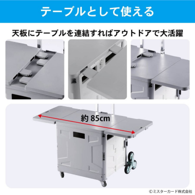 ミスターカード株式会社は(本社:埼玉県川口市)は、アウトドアグッズで1度使ったら手放せない!「折りたたみ段差キャリーカートテーブル付き」を2021年7月29日(木)から発売します。段差や階段を登れる3輪タイプは、平地でも安定してコロコロできてとっても楽チン!ペットボトル12本入るので、食材の買い出しにも便利です。コンテナに入れた釣具やキャンプ用品などクルマのトランクに入れて持ち運べます。フタを付ければ荷物がはみ出ず、フタの上に座れることができるので草野球の応援などで活躍します。天板を連結すればテーブルとして家族や友達とお弁当などを楽しめます。本体は折り畳めるので、自宅の収納場所にも困りません。miraiONが提供する暮らしを便利にするキャリーカートはいかがでしょう。