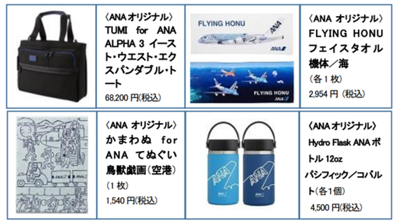 今回の「AIRPORT in GINZA」では、ANAの公式ECサイト「ANAショッピング A-style」で販売しているANAオリジナル商品の中から、ANAオリジナルエンブレム入りのバッグやハワイ関連グッズ、そしてANAロゴ入りボトルや人気の和風小物「かまわぬ」シリーズなどを販売します。