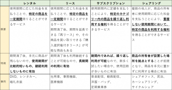『モノを所有せずにシェアする』−こうした新しいスタイルの消費・購買活動として「レンタル」「サブスク」などが挙げられる。これらのサービスの特徴は以下のようにまとめられる(表1)。