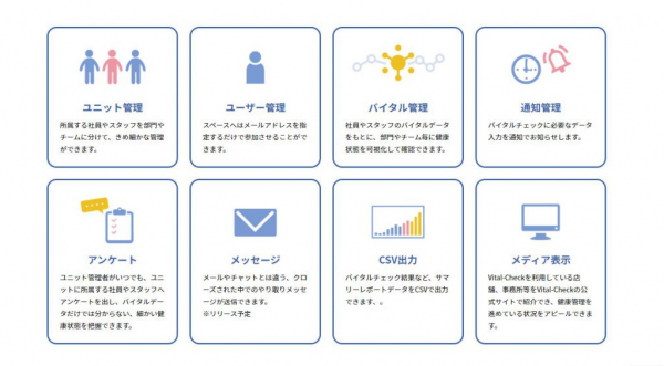 主要機能は、体温・血圧などのバイタルデータの管理やアンケート集計をはじめ、以下の通りとなっております。