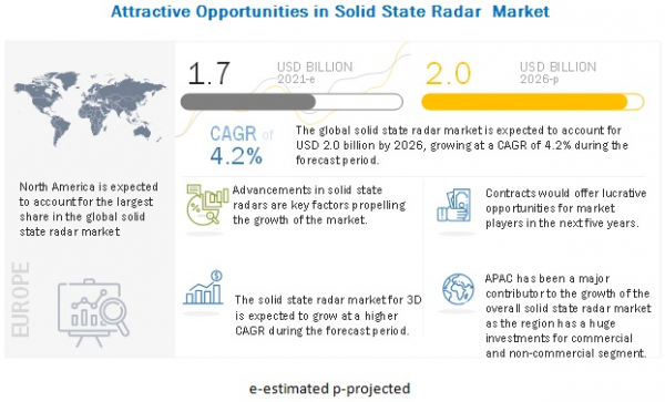 MarketsandMarketsは当レポートの公開資料において、固定化レーダー(ソリッドステートレーダー)市場規模は2021年末までに17憶ドル、2026年には20億ドルに達し、2021年から2026年までのCAGRは4.2%になるという予測結果を発表しています。