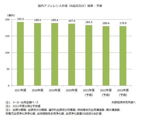 【矢野経済研究所プレスリリース】アフェレシス市場に関する調査を実施(2021年)〜2020年度のアフェレシス市場(8品目合計)は前年度比99.0%の187.6億円〜