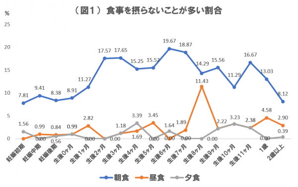 この結果から分かることは、生後間もない頃は夜間でも授乳やおむつ替えなどのお世話を頻繁に行う必要があるため、(1)朝食を摂る時間や体力がない(2)朝食と昼食で一食になっている、などの理由が考えられる。