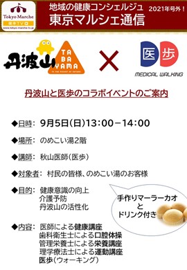 また、9月5日には地域の高齢者や観光客を対象として、アグリマスにおいては首都圏より医師を招いての「医歩ウォーキングセミナー」を、RARECREWにおいては「福祉用具の無料相談会」を同時開催いたします。