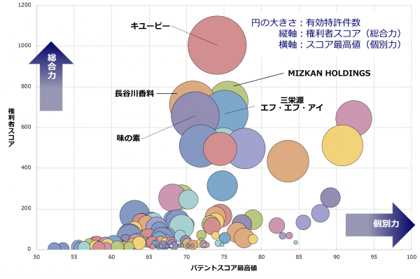 醤油、マヨネーズ、ケチャップ、チーズソースなど、食卓において調味料は欠かせない存在です。食品各社は消費者の食欲増進のため、調味料の風味向上や劣化防止に向けて日々開発を進めています。今調査では日本の特許庁で公開されている「調味料技術」全般(テーマコード:4B047)について、個別特許の注目度を得点化する「パテントスコア」をベースに、特許の質と量から総合的に見た評価を行いました。