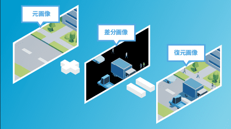 カメラデータの動きがあった部分だけを抽出してクラウドサーバーに転送、復元・再生する、特許取得「差分転送」とAI画像解析を組み合わせ、ヒトやモノの動きが一目瞭然です。侵入者の動き物体の変化などを瞬時に検知できます。