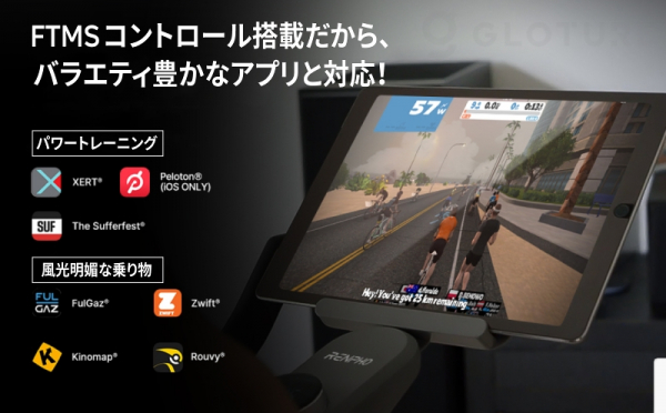 もちろん、Zwiftの他にも、Kinomap、FulGaz、Rouvy、XERTなど、さまざまなサイクリングアプリに対応。