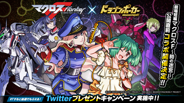 9月17日(金)より、アニメ『マクロスF』とのコラボを記念した「Twitterプレゼントキャンペーン」を開催いたします。『ドラゴンポーカー』公式Twitterアカウントをフォローし、対象ツイートをRTしていただいた方の中から抽選で、『劇場版マクロスΔ 絶対LIVE!!!!!!』同時上映『劇場短編マクロスF〜時の迷宮〜』デジタル映画鑑賞券などをプレゼント!キャンペーンへのたくさんのご参加お待ちしています!