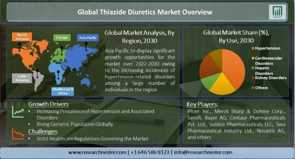 高血圧とそれに関連する障害の有病率の増加、および高齢者人口の増加は、この市場の進歩を後押しすると予想されます。さらに、ライフスタイルパターンの急速な変化により、世界中の人々の間でさまざまな代謝障害の有病率が高まり、これらの障害の治療に使用される薬物の需要が増加しています。また、市場の成長はまた、高ナトリウム含有不健康な食品の消費の増加、高血圧の有病率の増加、および世界中のチアジド利尿薬の分野における技術の進歩などの要因に起因する可能性があります。レポートは、成長ドライバー、市場機会、課題、脅威を含むいくつかの主要な市場ダイナミクスに強調いています。