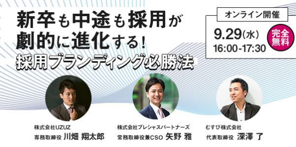 ブランド構築の理論を応用してコンサルティングとクリエイティブを行う、むすび株式会社(本社:東京都目黒区、代表:深澤了)は、2021年9月29日(水)、株式会社UZUZ(本社:東京都新宿区、代表:岡本 啓毅)、株式会社プレシャスパートナーズ(本社:東京都新宿区、代表:?? 誠司)と3社合同セミナー、「新卒も中途も採用が劇的に進化する!採用ブランディング必勝法!」を開催いたします。