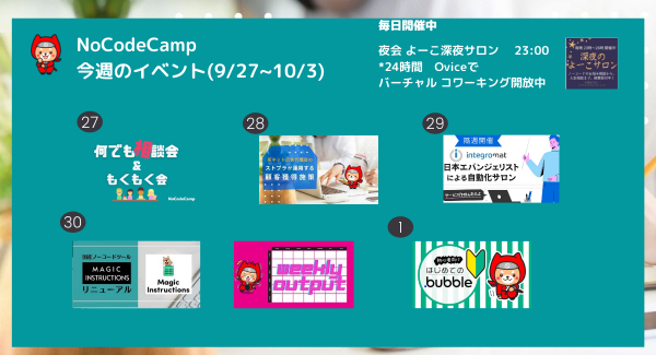 NoCodeCampでは、9月最後の週も7日連続イベントを実施します。10月3日(日)まで、サロン会員は毎日NoCodeに関連するイベントに参加できます。初心者に向けた、おなじみの「はじめてのBubble」は10月1日(金)実施。単発のイベントや毎週毎日開催のイベントまで、さまざまなイベントをご用意しています。