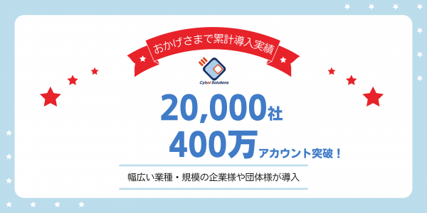 サイバーソリューションズ株式会社(所在地:東京都港区、代表取締役社長:秋田健太郎、以下当社)は、20年にわたって企業や自治体向けに、クラウド及びオンプレミス型のWebメール機能搭載の統合型メールサーバ、メールアーカイブ、メールセキュリティ関連ソリューションを販売し、累計導入社数が2021年8月末時点で20,000社、400万アカウントを突破したことをお知らせいたします。