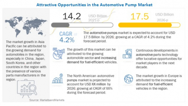 MarketsandMarketsは公開資料において、自動車用ポンプ市場は2021年中に142億ドル、2026年までに175億ドルへと成長し、CAGRで4.2%になるとの予測結果を発表しました。世界の主要自動車メーカーは消費者からの需要増加を受けて、低燃費車の導入に注力しています。また汚染悪化防止のためにいくつかの国では乗用車と商用車向けに厳しい排出基準を設けています。