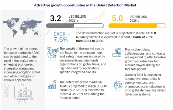 MarketsandMarketsは公開資料において、 世界の欠陥検出市場は2021年中に35億ドル、2026年までには50億ドルへ成長し、2021年から2026年までのCAGRは7.5%になるとの予測結果を発表しました。