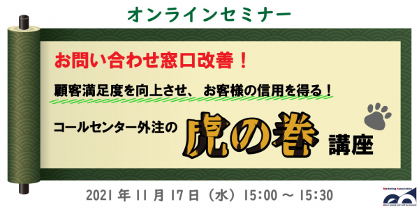 コールセンターサービスを提供しているマーケティングアソシエーション株式会社(本社:東京都台東区 代表取締役:相内あゆ美、以下当社)は、2021年11月17日(水)に、ウェビナー「お問い合わせ窓口改善!顧客満足度を向上させ、お客様の信用を得る!コールセンター外注の虎の巻講座」を開催いたします。