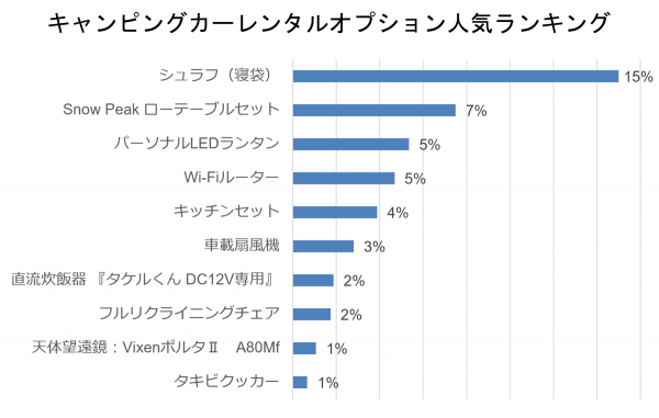 コロナ禍におけるアウトドアブームで急増しているのがアウトドアグッズを所有せず、手ぶらで車中泊やキャンプをする利用者であった。キャンピングカーレンタル利用者の中でもキャンプ人気が急上昇しており、レンタルオプションとしてシュラフ(寝袋)が他をおいて一番人気となった。