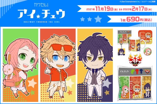 大人気TVアニメ『アイ★チュウ』が「カワセルくじ」に新登場です!「F∞F」、「Twinkle Bell」、「I B」、「ArS」の4ユニットのカラフルで可愛いミニキャライラストが色々なグッズに展開!S賞は一辺45cmの大きなクッション、A賞はマグカップ、B賞コースターで各ユニットのデザインとなっており、C賞以降はステッカーやハンカチなど各キャラクターのデザインとなっております。はずれ無しの「カワセルくじ」だからこそ出来る、すべてが楽しいグッズとなっています。