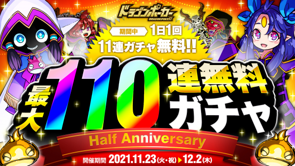 おかげさまでリアルタイム合体カードバトル『ドラゴンポーカー』は、2021年5月に8周年を迎え、来年2022年5月にはサービス開始9周年を迎えます。これを記念し、「ハーフアニバーサリー無料最大110連ガチャ」を開催いたします。どうぞご期待ください!